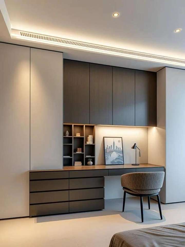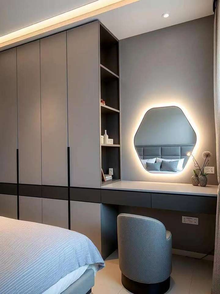 Armoire de chambre intégrée sur mesure avec coiffeuse flottante et miroir rétroéclairé par LED pour hôtels et appartements de luxe