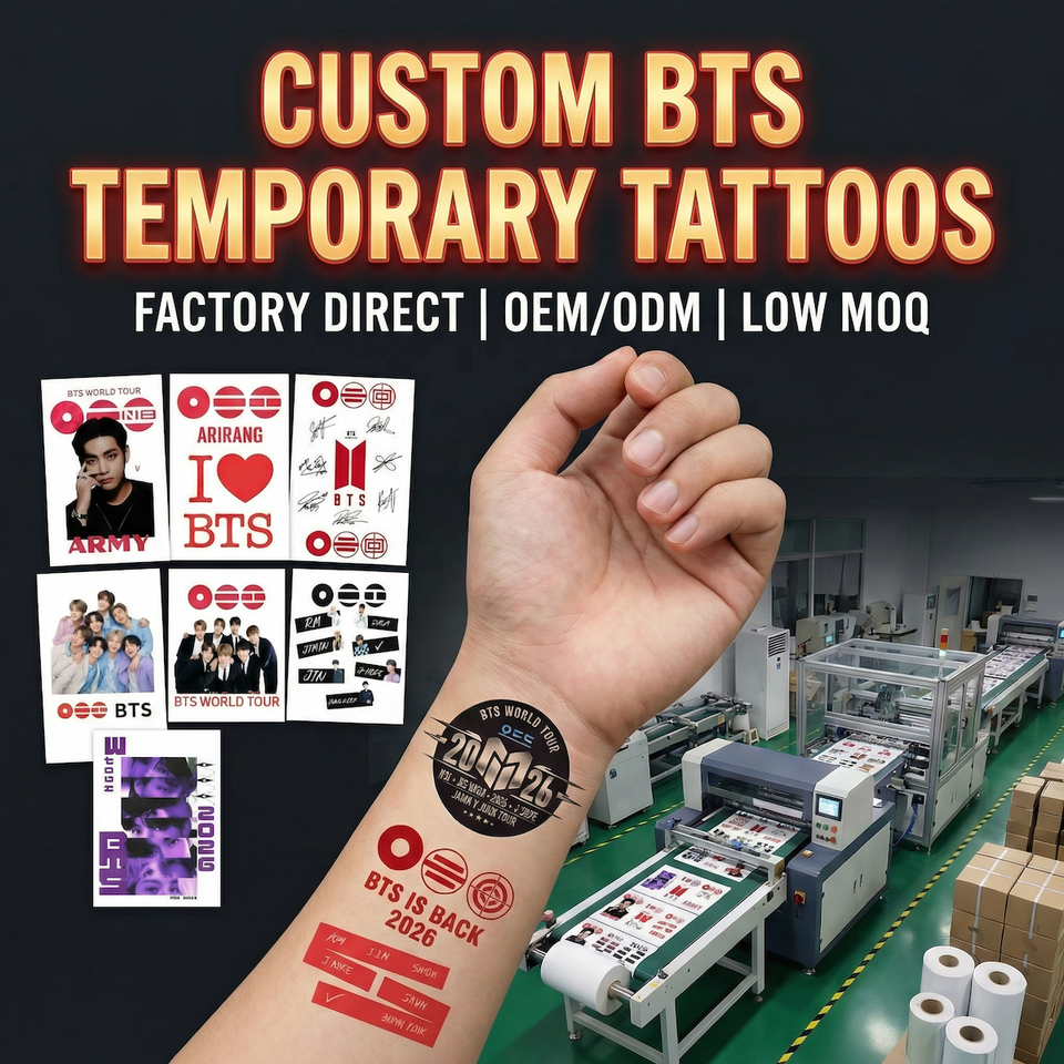 Tatouages temporaires personnalisés Kpop BTS ARMY World Tour 2026 | Autocollants pour ventilateurs imperméables | Fabricant OEM direct | EN71 ASTM CE Non toxique