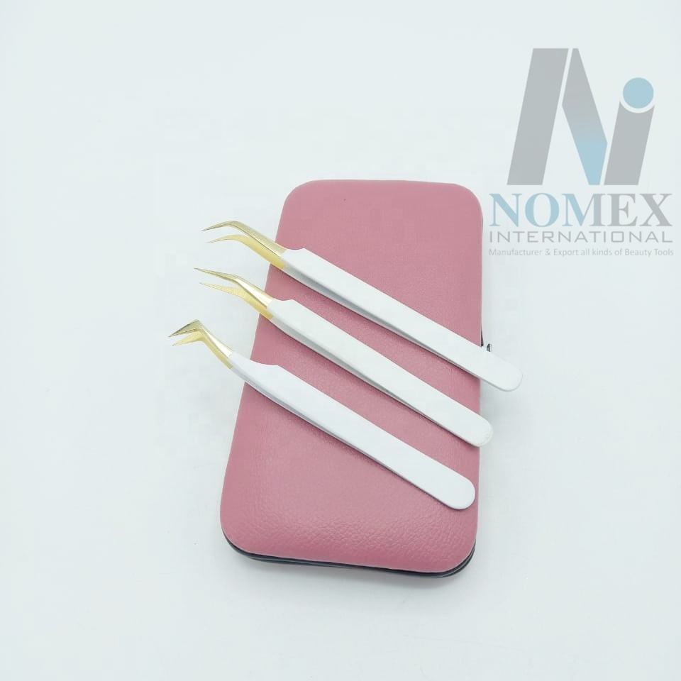Ensemble L personnalisé blanc enduit de poudre cils pince à épiler volume russe courbé durable en acier inoxydable pointu privé