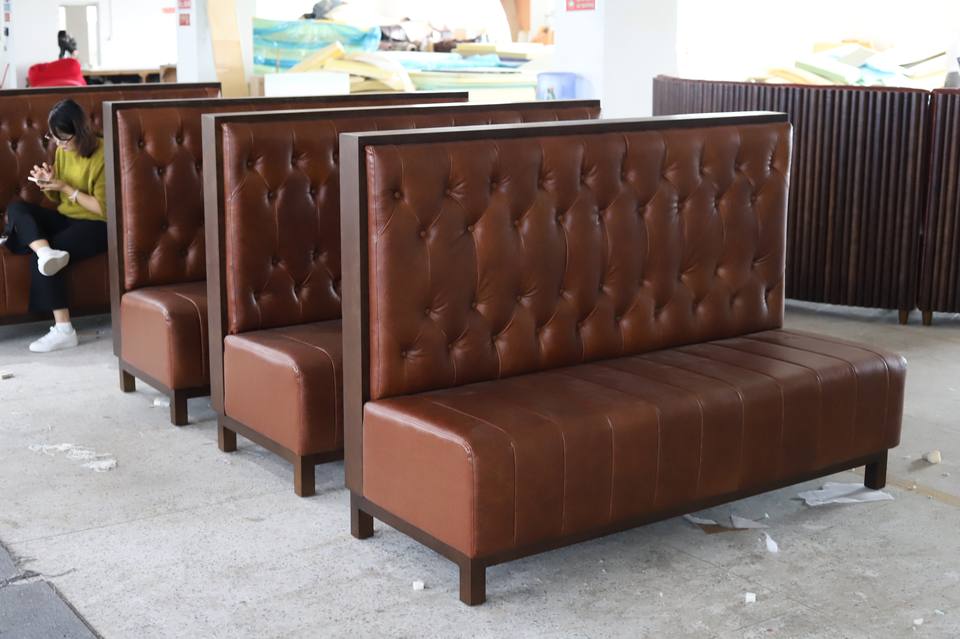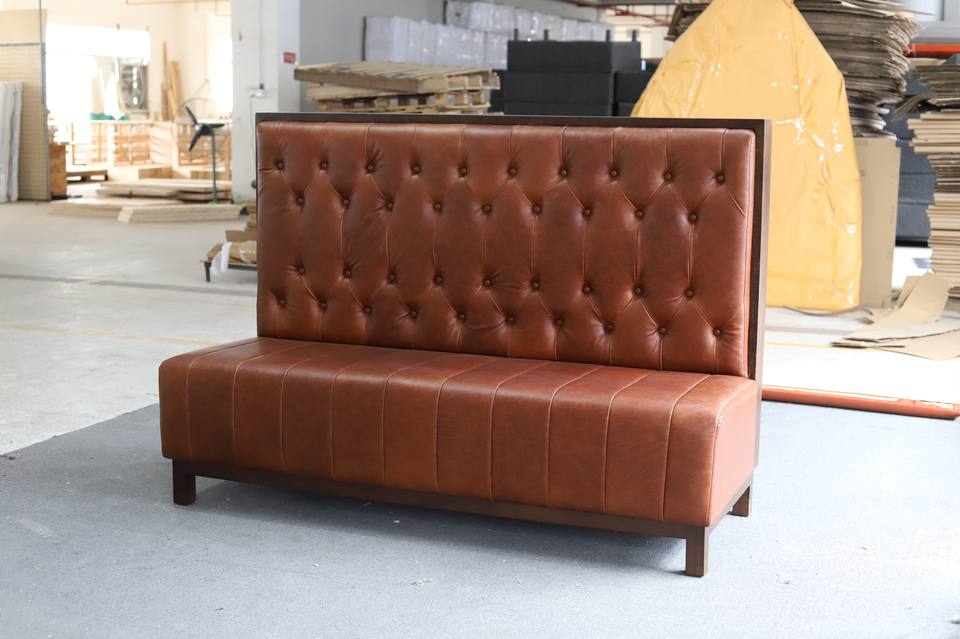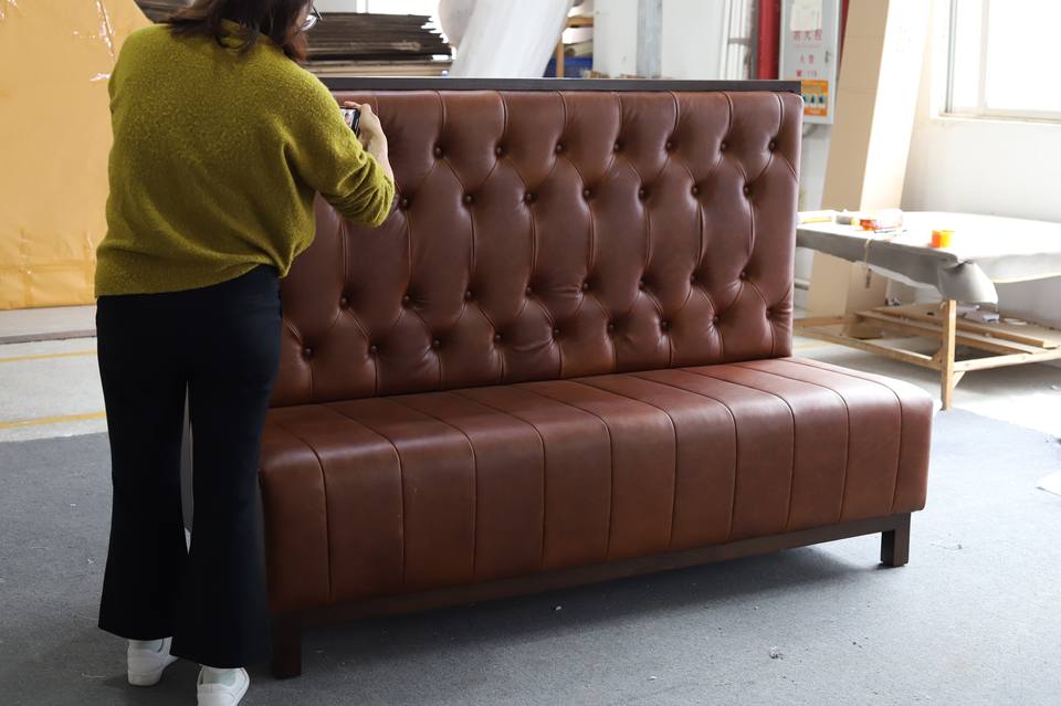 Ensemble de mobilier de restaurant en forme de L sur mesure avec revêtement en cuir PU, banquette capitonnée à dossier haut et table pour hôtel et café