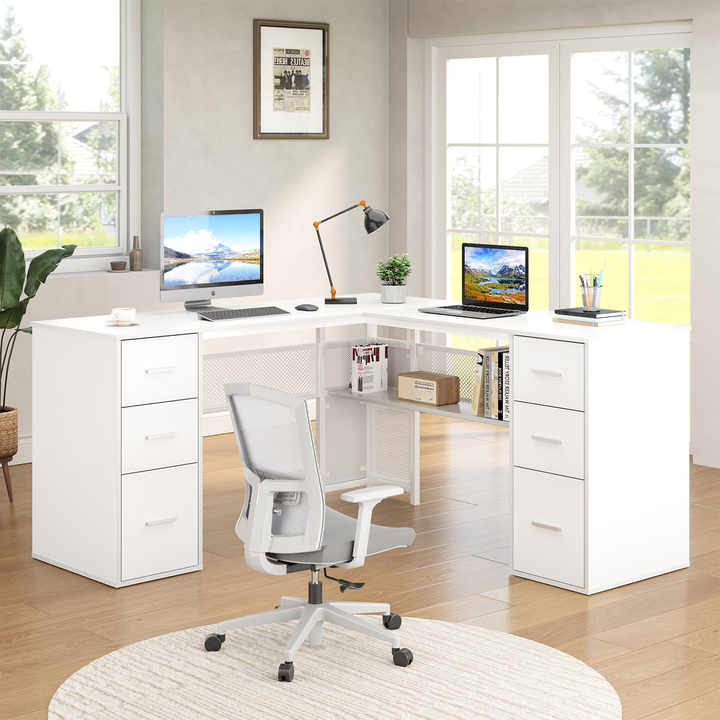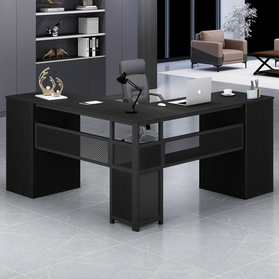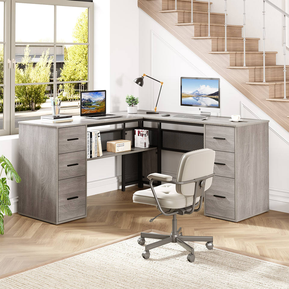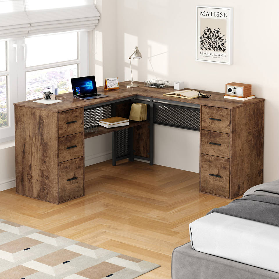 Bureau en L personnalisé avec tiroirs, bureau d'angle moderne en métal et bois en forme de L avec armoire à dossiers pour bureau à domicile, chambre à coucher