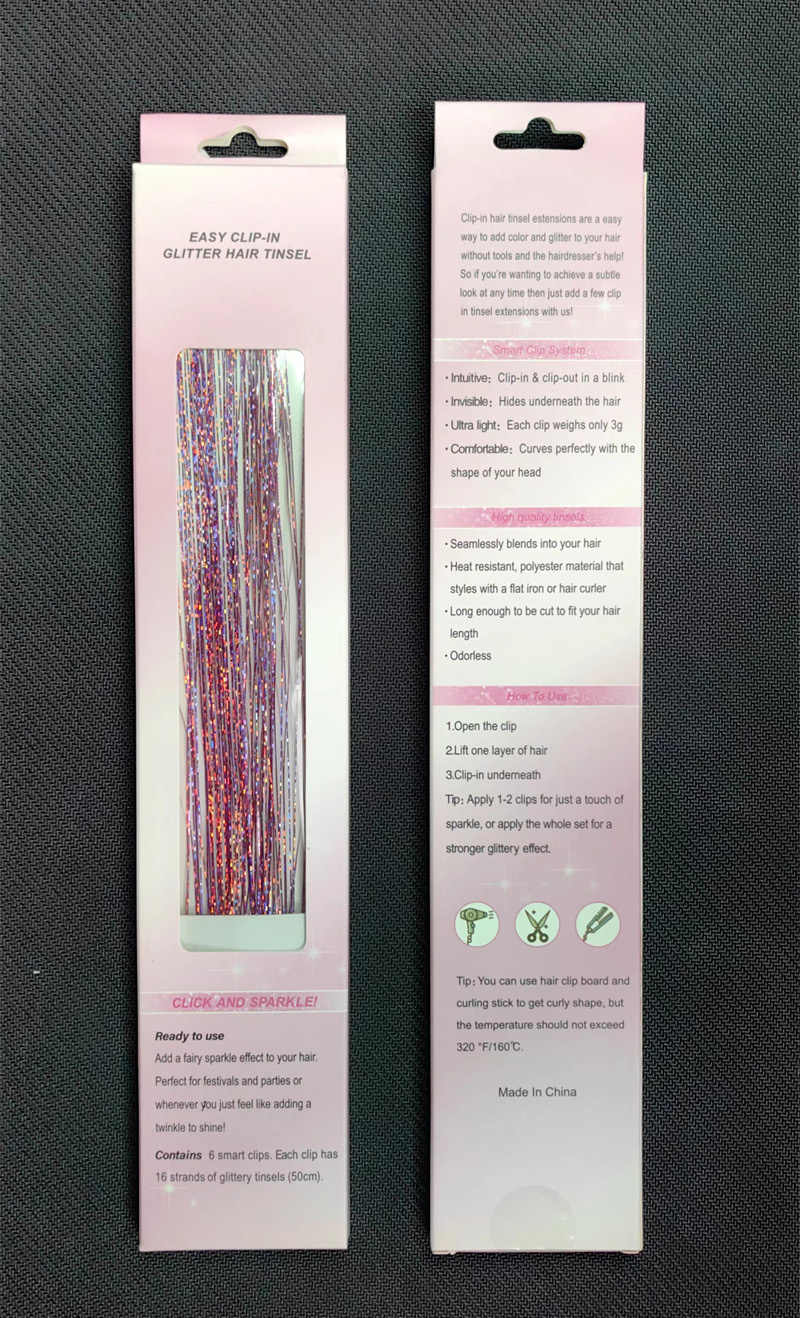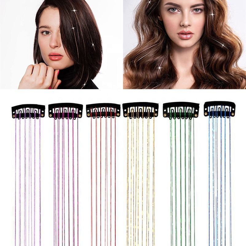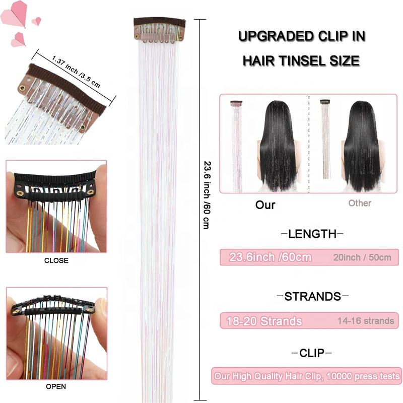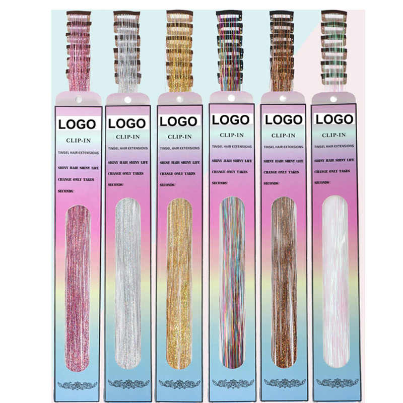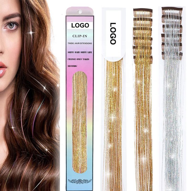 Custom LOGO 6 Pcs Set 24 Inches Shinny Party Highlights Sparkle Tinsel Hair Extensions Easy Clip-in Glitter Hair Tinsel