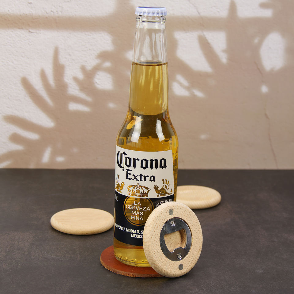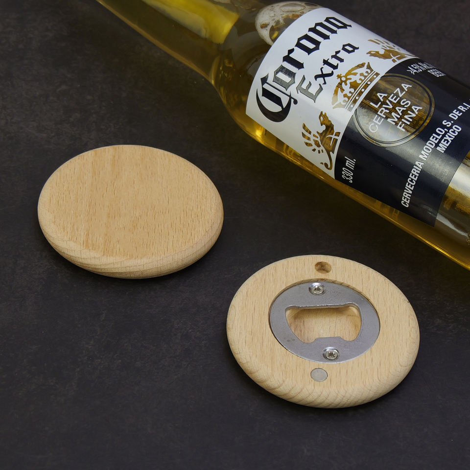 Ouvre-bouteille de bière en bois de similicuir avec gravure au laser LOGO personnalisé Ouvre-bouteille rond avec aimant pour réfrigérateur