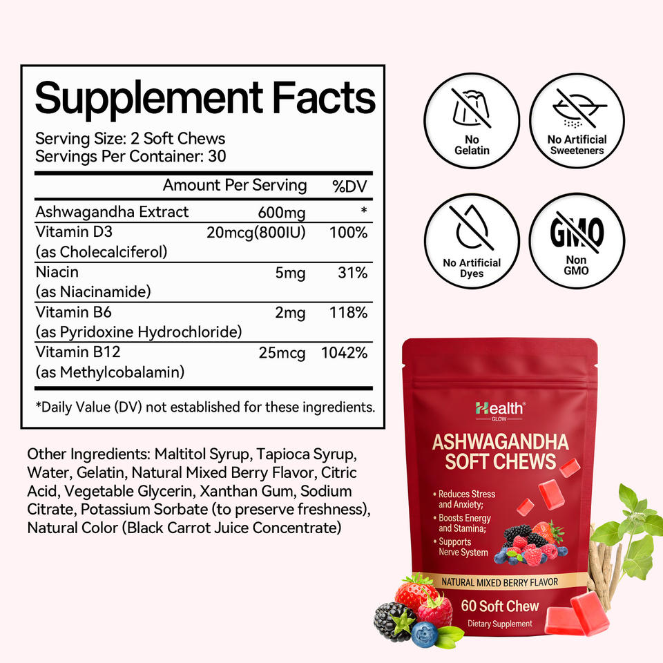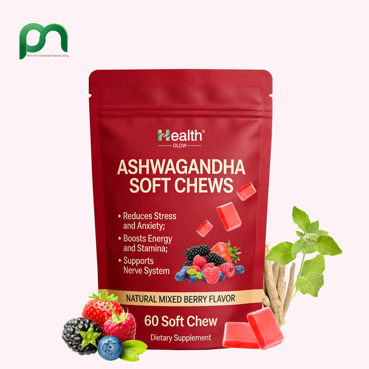 Bonbons à mâcher multivitaminés personnalisés avec logo, Ashwagandha de qualité supérieure, apaisent les nerfs, soulagent la fatigue, fabrication en vrac, OEM, fournisseur