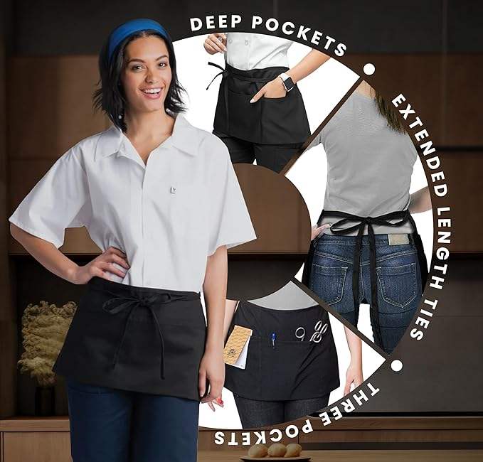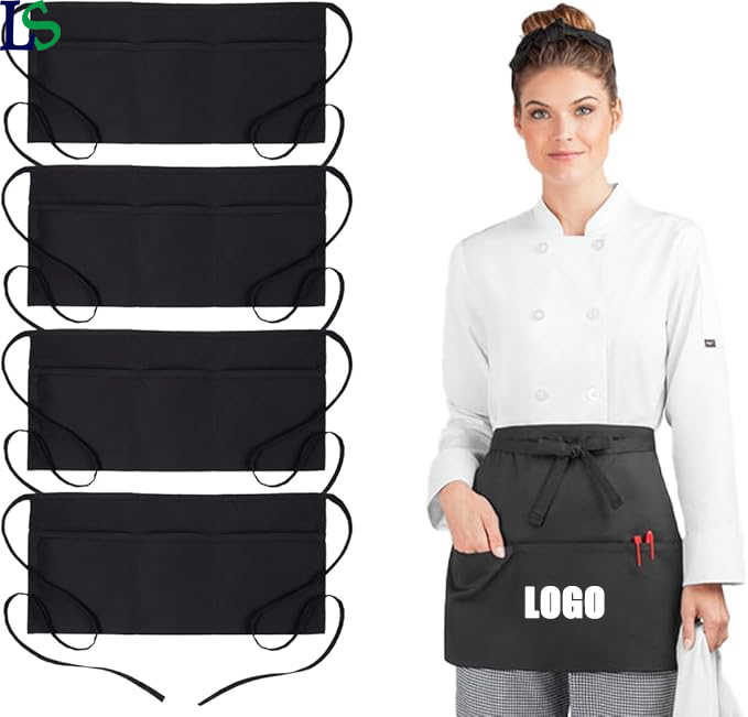 Tabliers de serveur LOGO personnalisé avec 3 poches Tablier de serveuse réglable à la taille 100% Demi-tablier en polyester pour le nettoyage de la cuisine