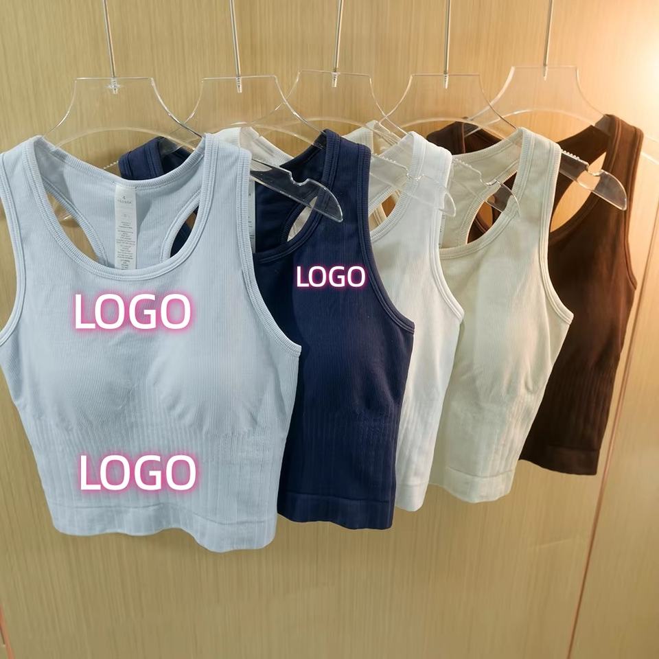 Soutien-gorge de sport d'été personnalisé avec LOGO, sans couture, tricoté, bretelles croisées, débardeur double couche côtelé, taille cintrée, maintien élevé