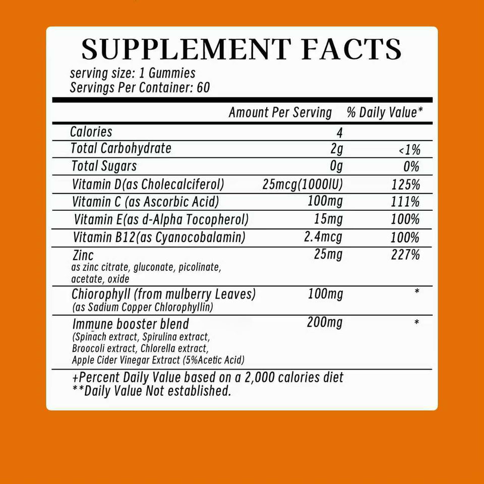 Ingrédient principal:Zinc, Vitamine C, Chlorophylle, Vitamine E, Vitamine B12, Vitamine D, Mélange pour renforcer le système immunitaire