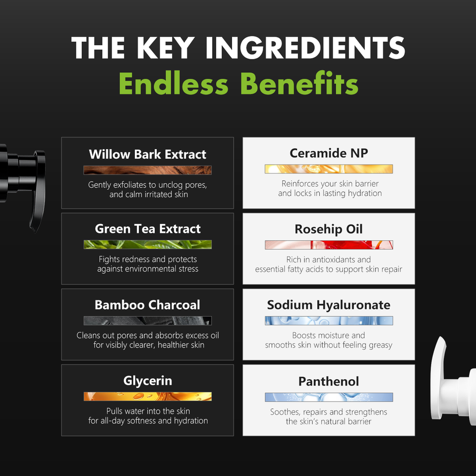 Glycérine, EXTRAIT D'ÉCORCE DE SAULE, EXTRAIT DE THÉ VERT, CHARBON DE BAMBOU
