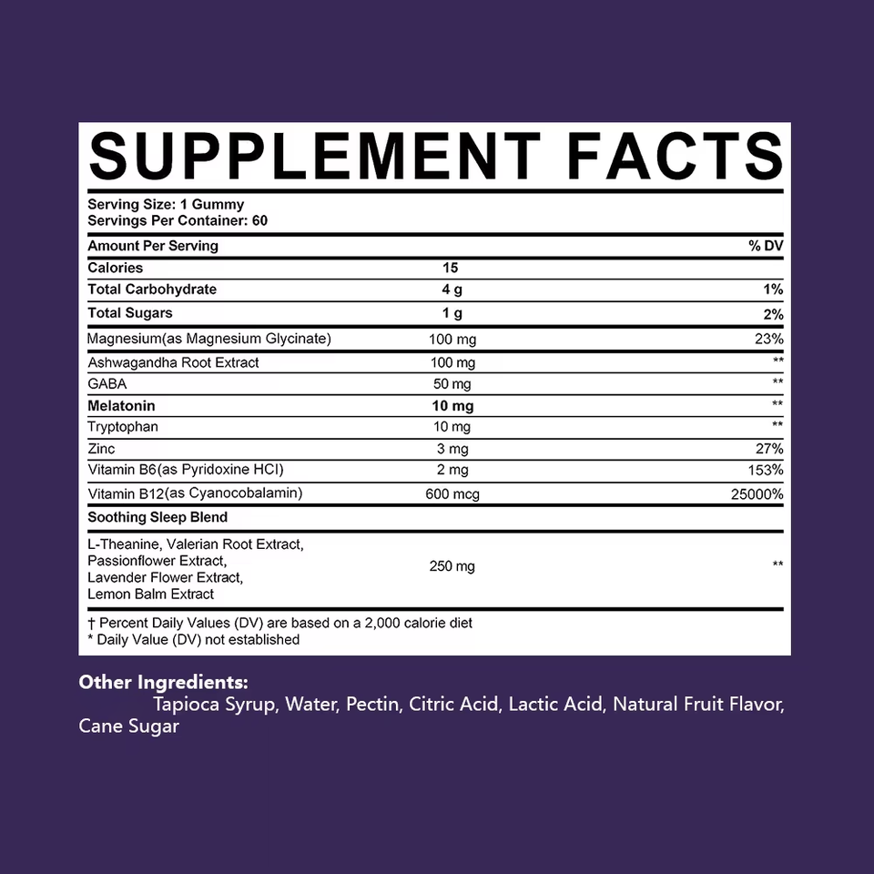 Ingrédient principal:Mélatonine, Magnésium, Extrait de racine d'ashwagandha, GABA, Tryptophane, Zinc, Vitamine B6, Vitamine B12, Mélange Apaisant pour le Sommeil