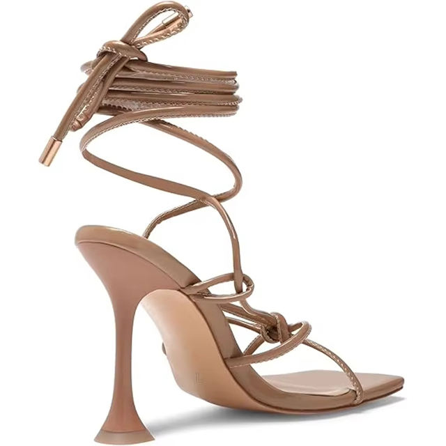Sandales pour femmes personnalisées tendance carré bout ouvert gladiateur marron en cuir Pu mince talon haut pour femmes