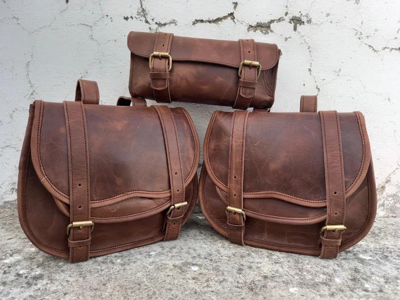 Custom Large Brown Leather Saddle Motorcycle Pouch Sport Style 3 Saddlebag with Custom Logo Duffle Travel Bags for Motorcyclists
