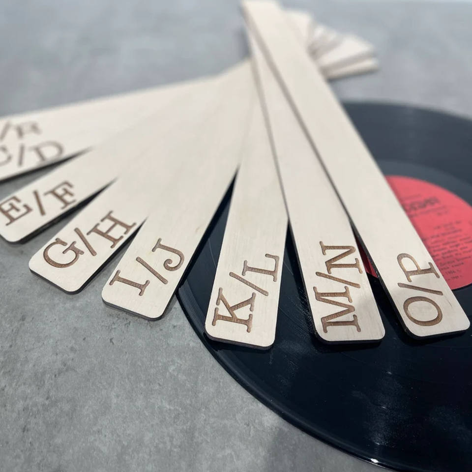 Organisation du disque vinyle, Solutions de stockage faites à la main, Diviseurs de disques en bois, Stockage d'enregistrement personnalisable, Accessoires pour passionnés de musique, Organisateurs de vinyle respectueux de l'environnement, Organisation et catégorisation de l'album, Stockage de musique rétro, Diviseurs d'enregistrement personnalisés, Affichages élégants de disque de vinyleThème