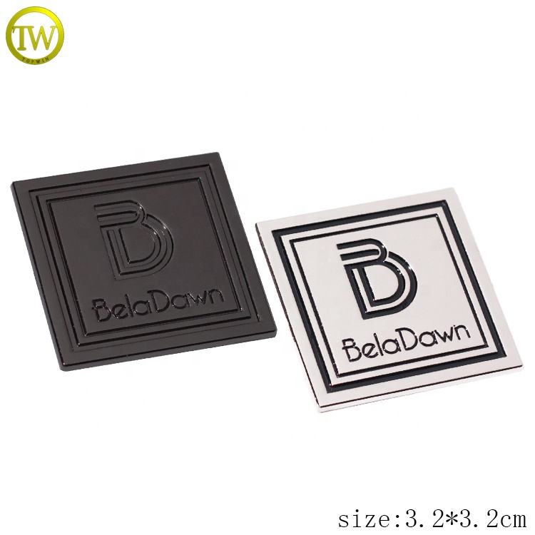 Logo de sac à main en cuir personnalisé Étiquettes métalliques carrées en alliage de zinc Plaque d'identification émaillée en métal couleur argent pour porte-monnaie Réduction tarifaire