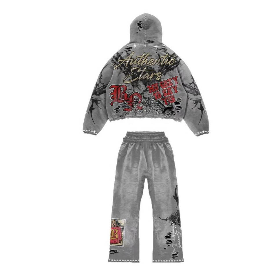 Ensemble de survêtement d'hiver grande taille pour homme avec pantalon évasé et empilé, et sweat à capuche, orné d'un patch brodé et d'une applique lettre imprimée sur mesure