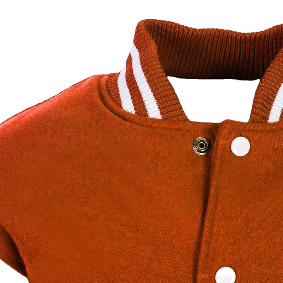 Veste universitaire personnalisée style Letterman, corps en laine orange, manches en cuir blanc, lettres en chenille, veste classique pour lycée et université 2026