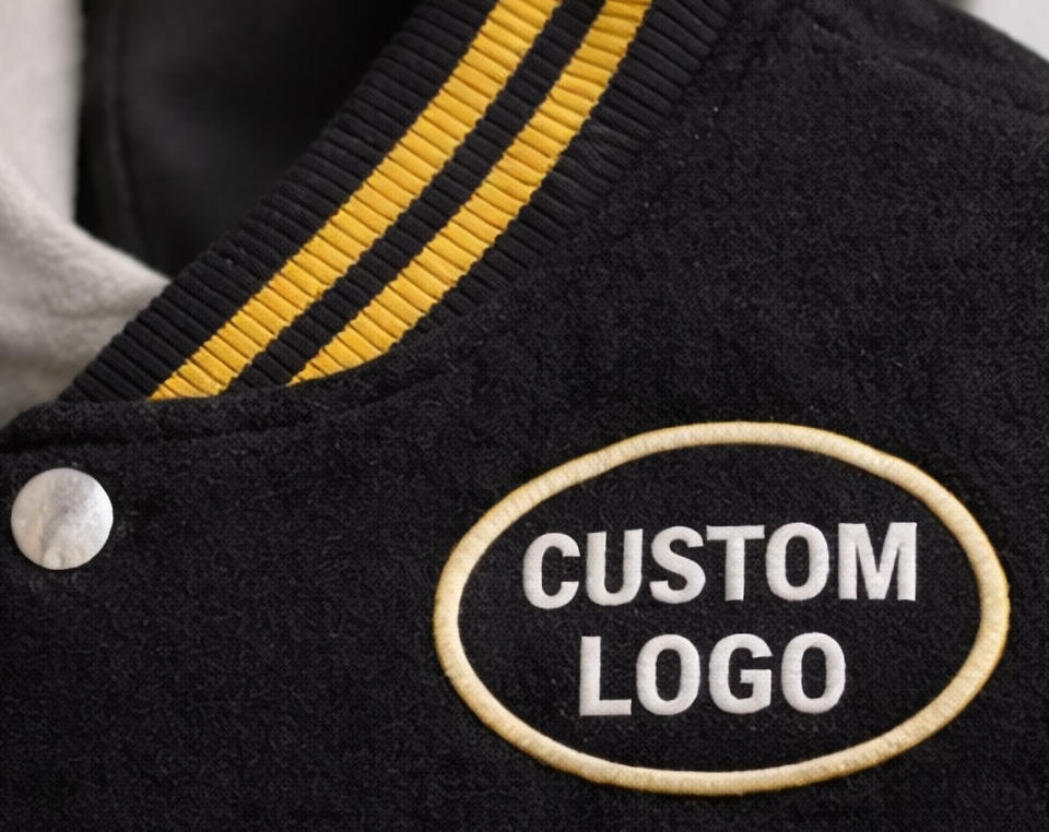 Blouson universitaire personnalisé unisexe en laine/polyester avec manches en laine, noir et or, chauffant, écologique, style universitaire américain, pour l'hiver