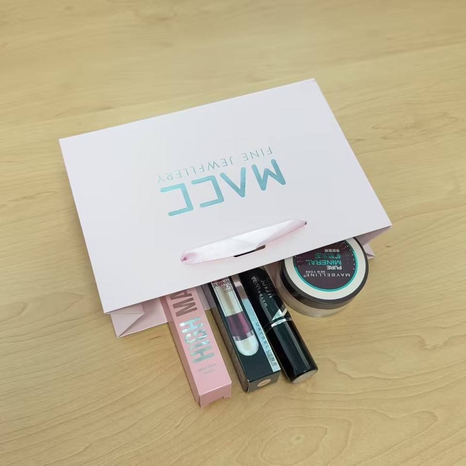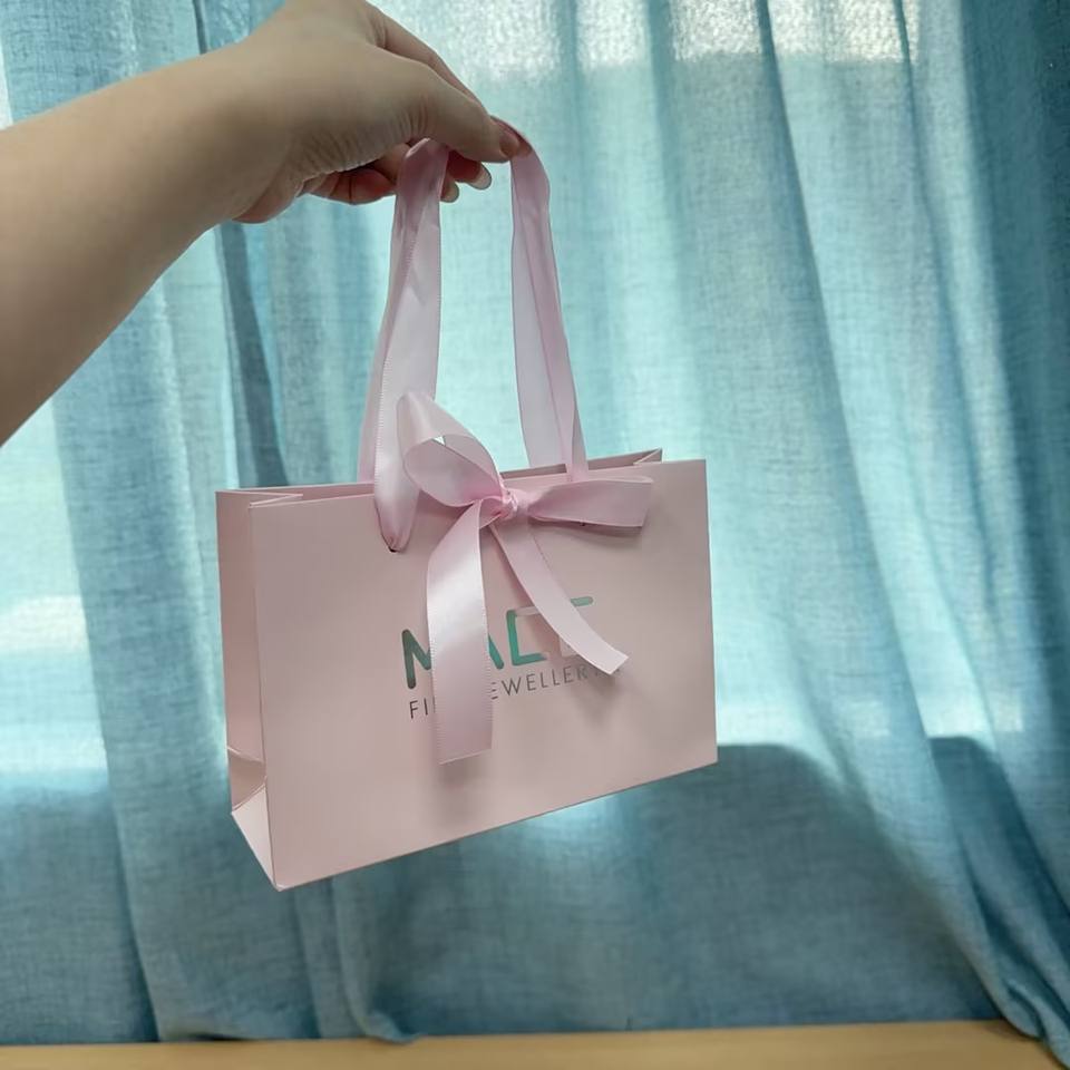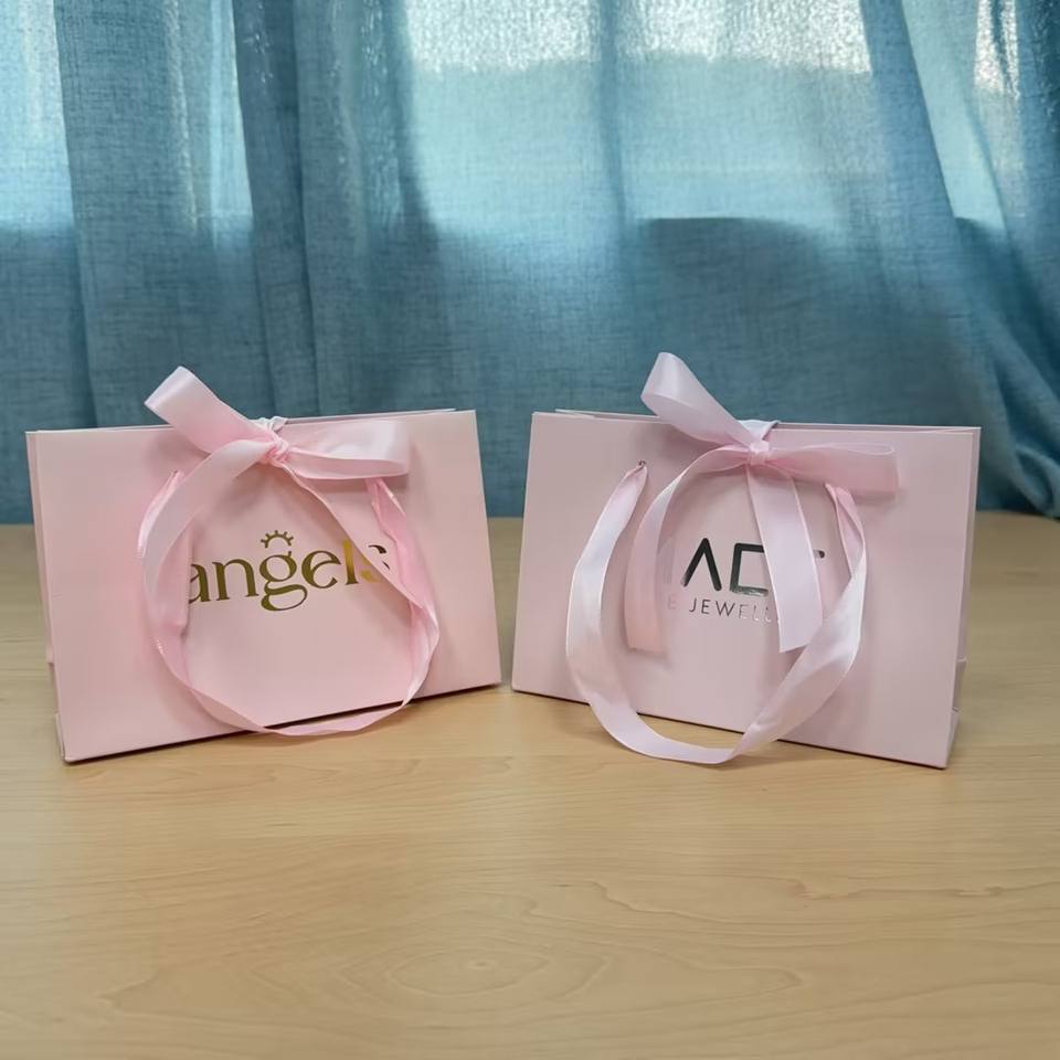Sacs shopping en papier rose clair personnalisés - Rose Pantone 667C avec logo estampé à chaud argenté pour l'emballage de cosmétiques et de bijoux