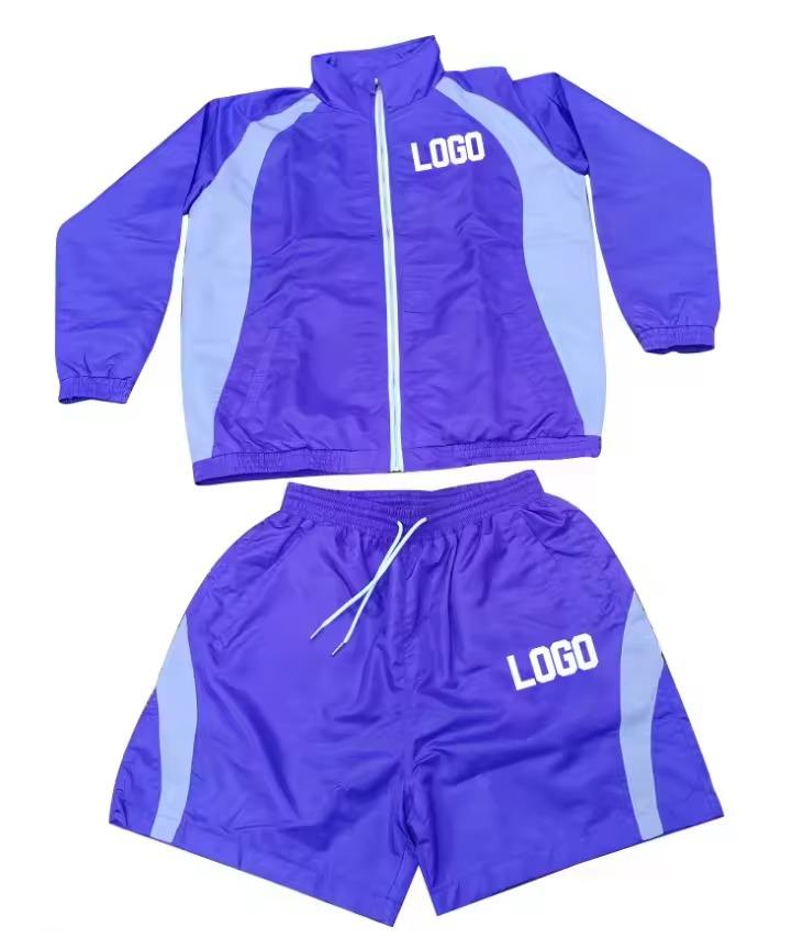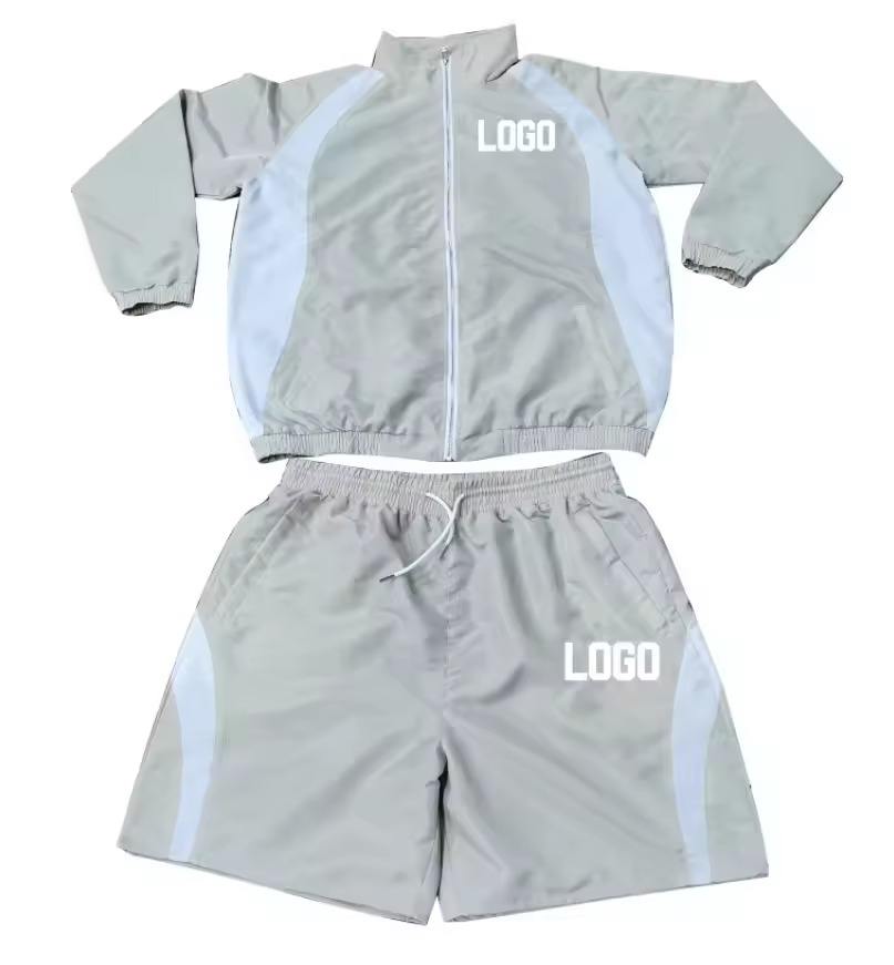 Ensemble de survêtement coupe-vent léger personnalisé en nylon avec veste et pantalon à bandes réfléchissantes et fermeture éclair, imprimé, pour le jogging