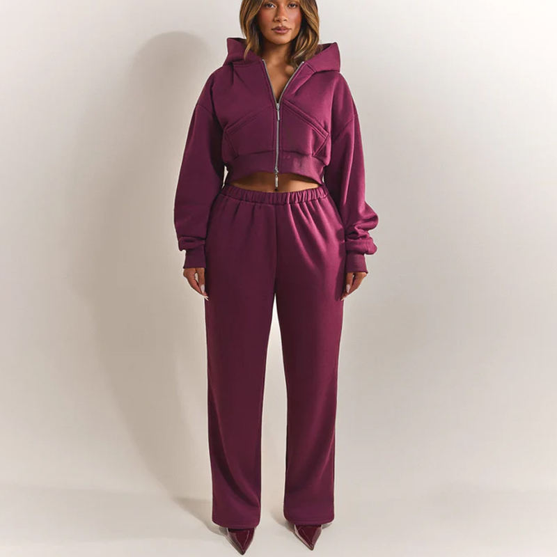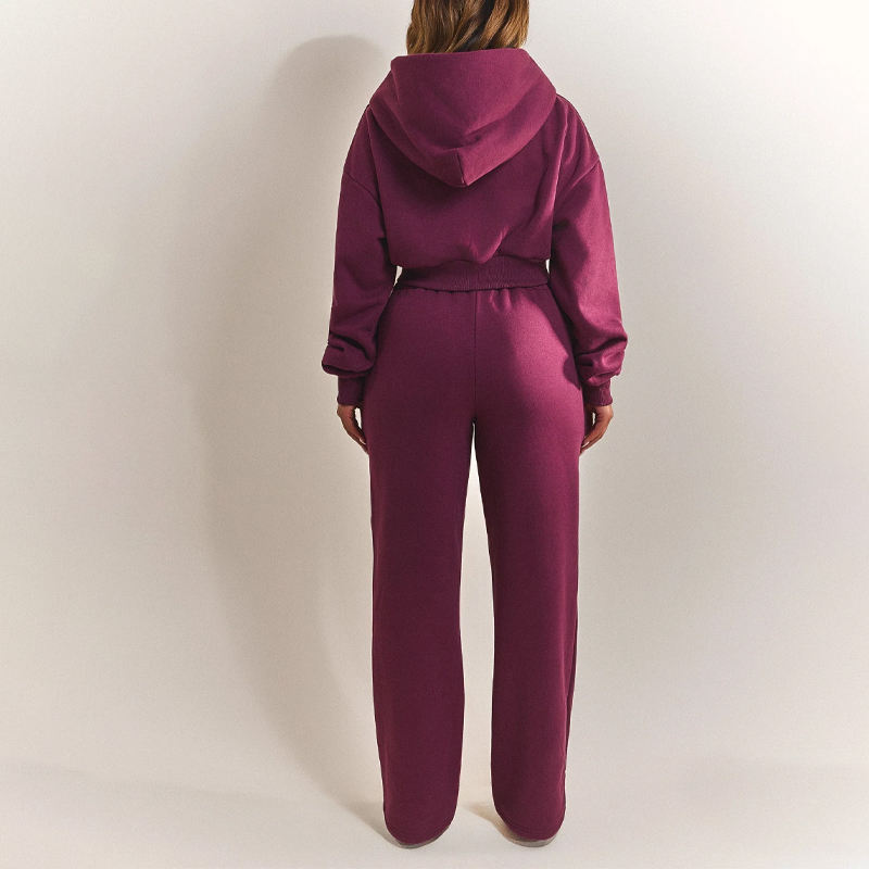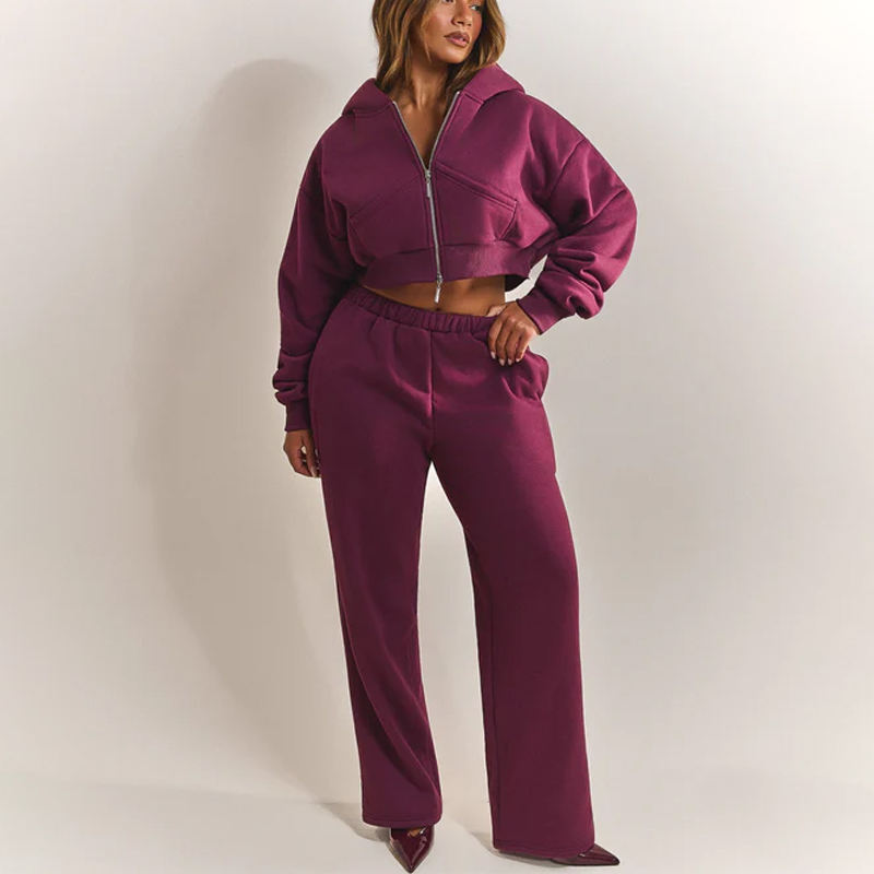 Ensemble survêtement femme personnalisé avec logo, 100% coton 450 g/m², comprenant un sweat à capuche zippé ample et court et un pantalon de survêtement ample