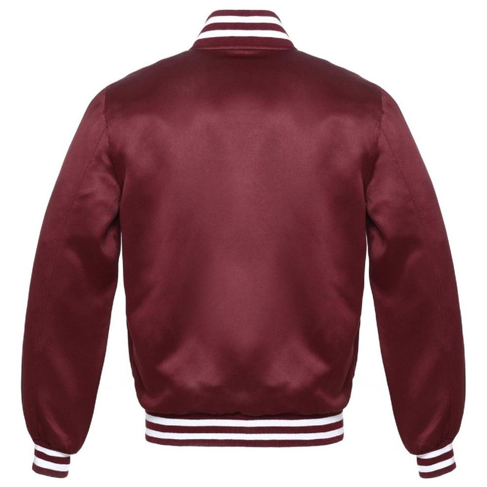 Blouson universitaire en satin bordeaux 100% polyester avec logo personnalisé style bombardier Letterman pour les sports d'hiver détail côtelé blanc bordeaux
