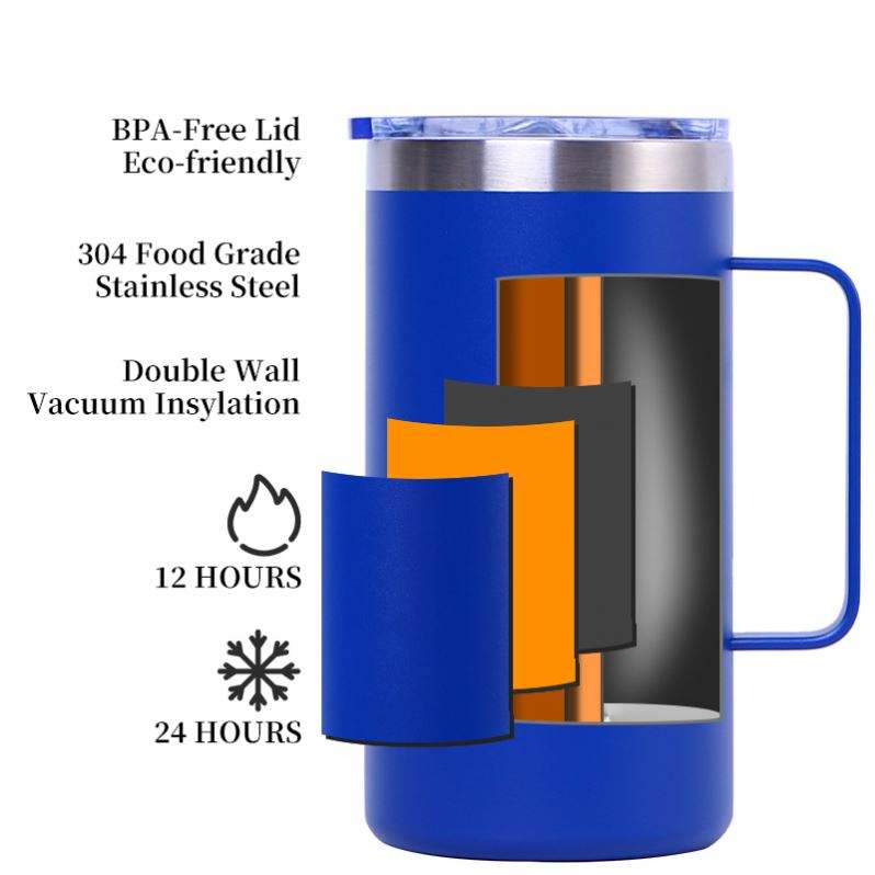 Mug à café isotherme en acier inoxydable avec logo personnalisé, revêtement poudré, double paroi sous vide, avec poignée et couvercle, 12oz 14oz