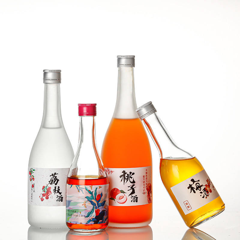 Bouteille en verre à col long pour saké, 250 ml-720 ml, avec logo personnalisé, transparente/givrée, bouchon à vis, pour vin de prune/vin de fruits/boissons