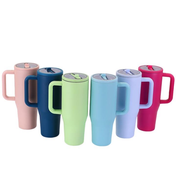 Mug de voyage en acier inoxydable à double paroi avec logo personnalisé, 40 oz, isolé sous vide, pour bière, café, avec paille rabattable et poignée