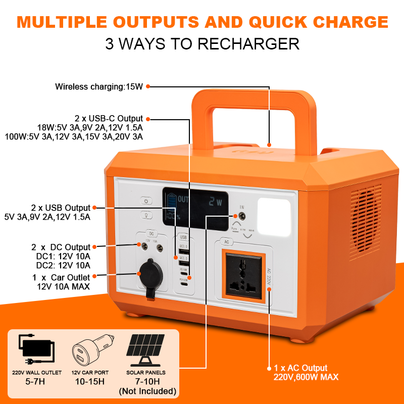 Station d'alimentation portable rechargeable solaire et automobile 600W LiFePO4 avec logo personnalisé, charge AC/DC et démarreur de batterie