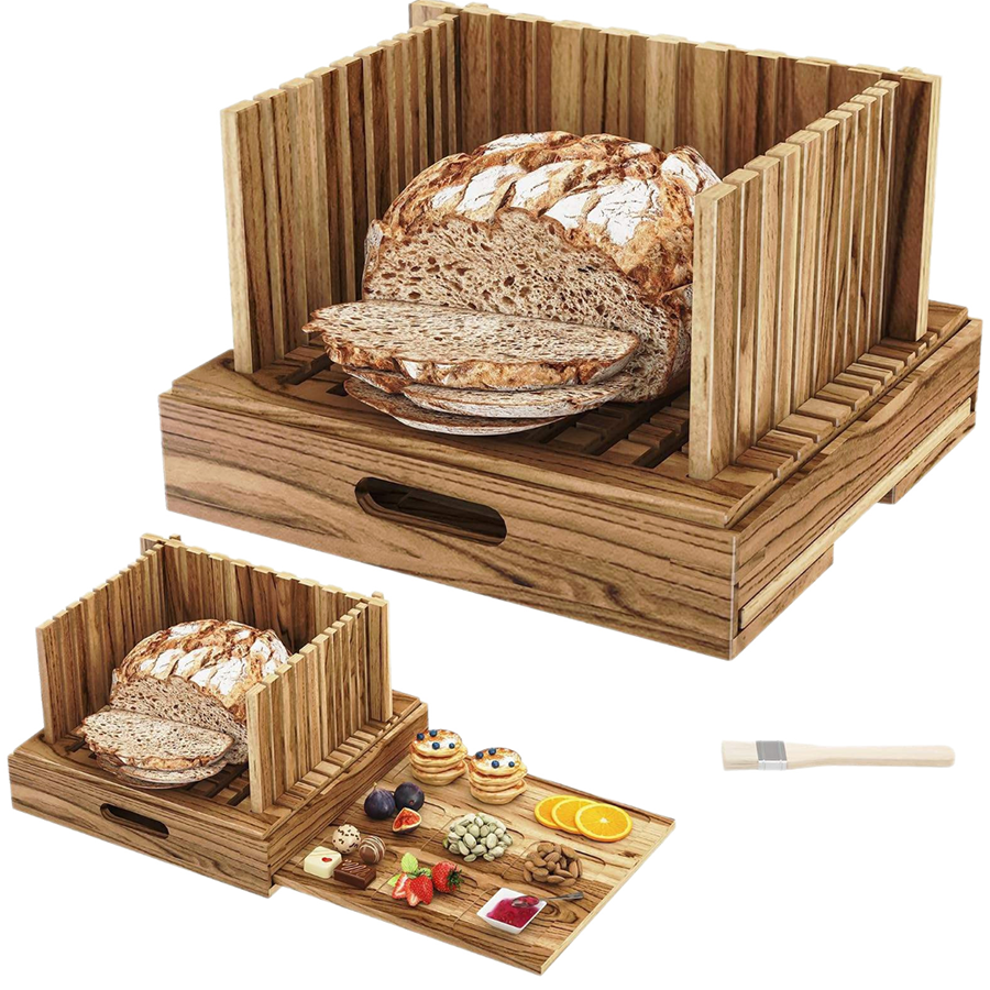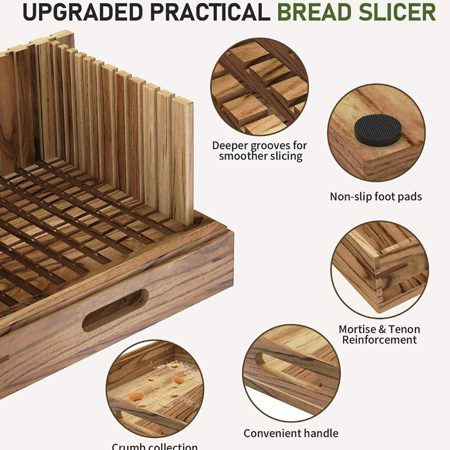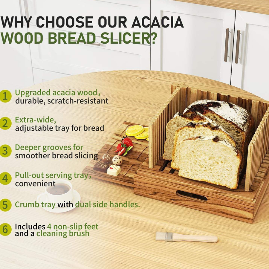Trancheur à pain en bois d'acacia avec logo personnalisé pour pain fait maison - Guide de découpe pliable en bambou avec plateau à miettes et plateau de service extractible