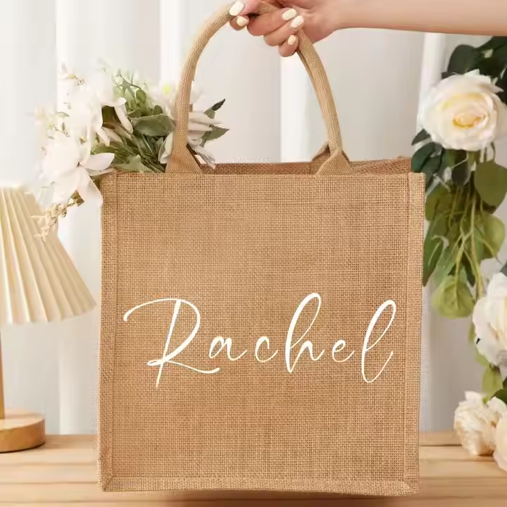 Sac fourre-tout en jute personnalisé avec logo disponible, écologique, couleurs mélangées, tendance, voyage, shopping, cadeau, petit format, imprimé à l'écran