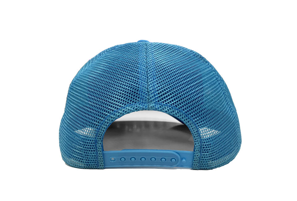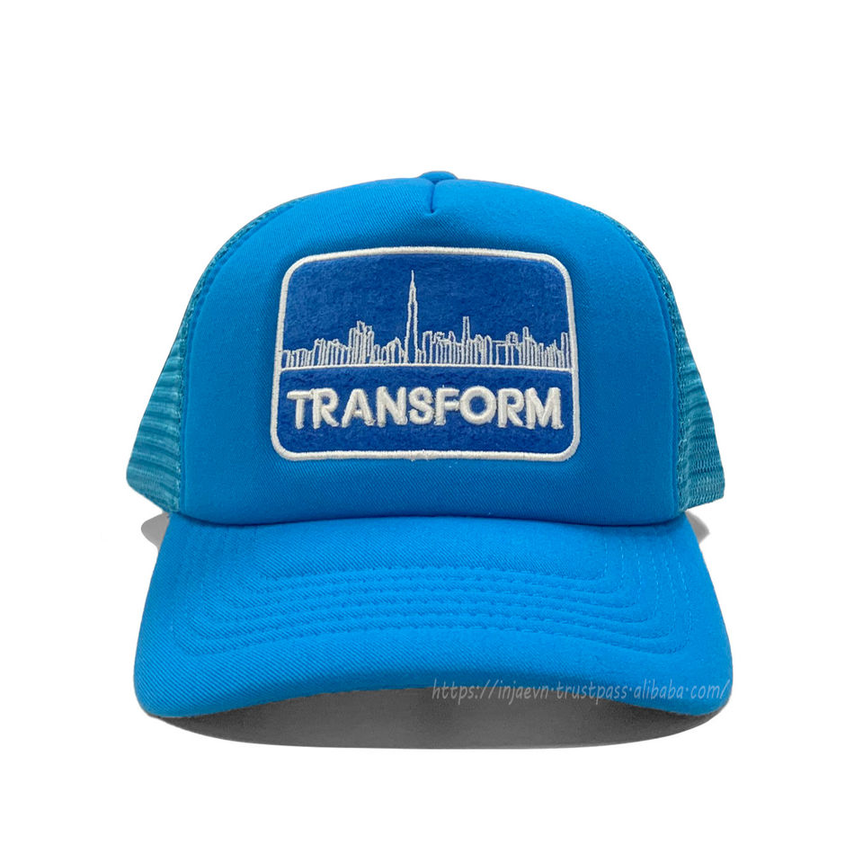 Chapeaux de camionneur en mousse bleue à logo personnalisé à la mode Hip Hop pour vêtements de plein air décontractés ÉMIRATS ARABES UNIS Patch Design En gros Injae Vina Chapeaux