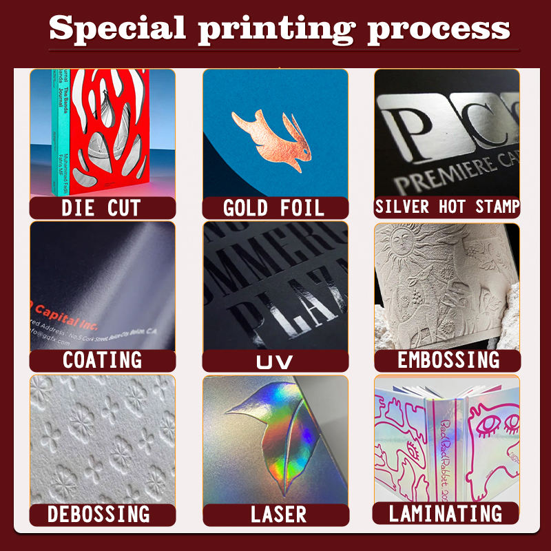 Finition dimpression:Dorure à chaud, Estampage à froid, Découpes à lemporte-pièce, Gaufrage, Gaufrage/Embossage, Flexographie, Paillettes