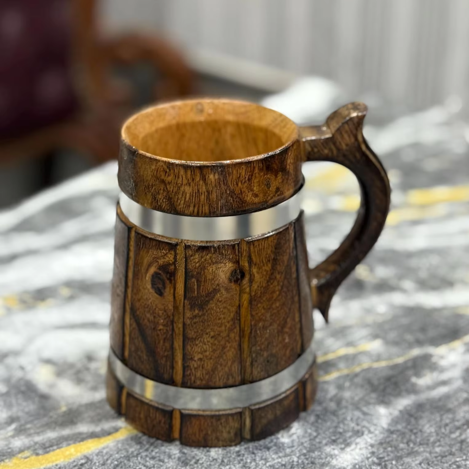 Chope à bière en bois durable de style classique avec logo personnalisé, doublure en acier inoxydable, écologique | Chope à bière réutilisable en bois pour