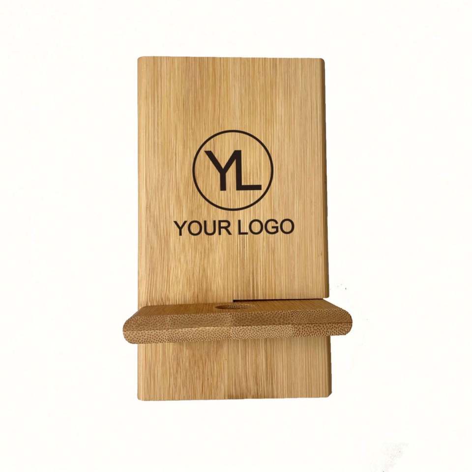 Support de téléphone portable promotionnel en bambou écologique détachable avec logo personnalisé et trou de charge