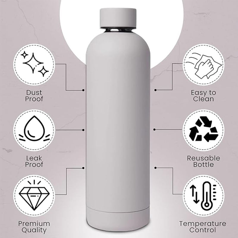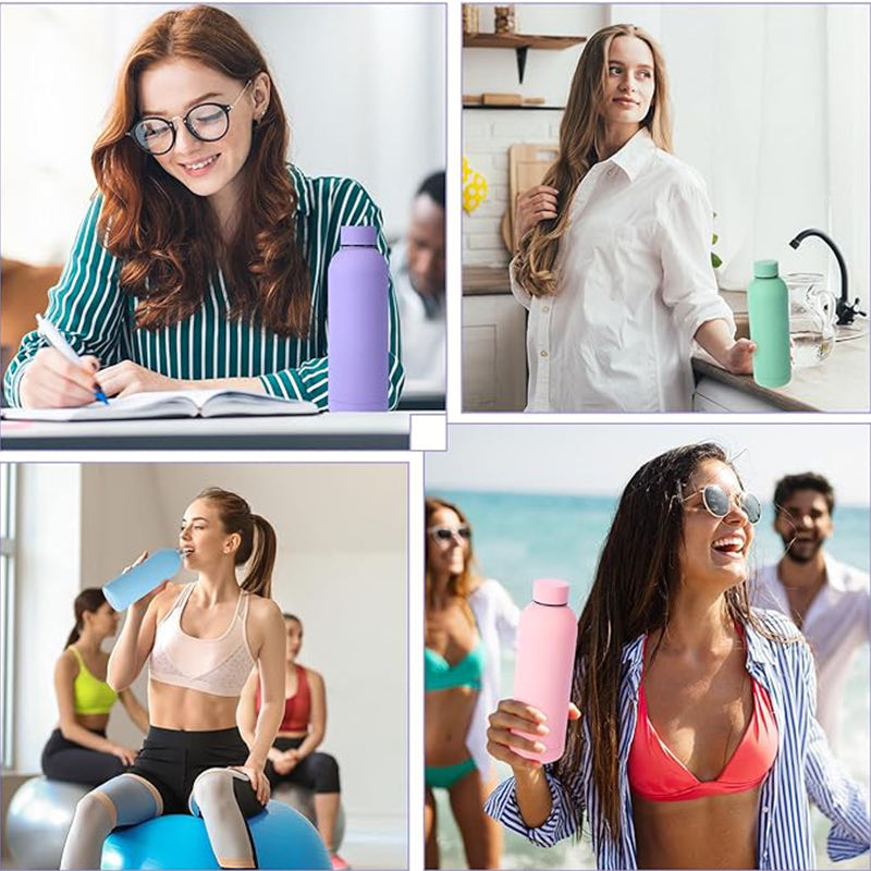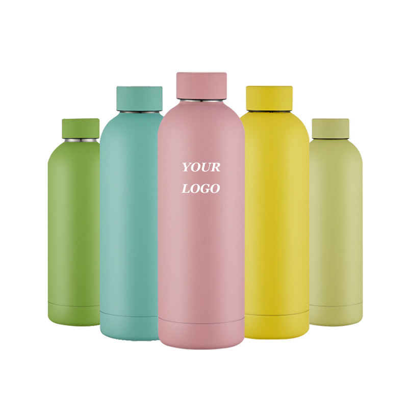 Bouteille d'eau sport en acier inoxydable à double paroi isolée sous vide de 500 ml avec logo personnalisé, à petite ouverture, finition caoutchoutée givrée