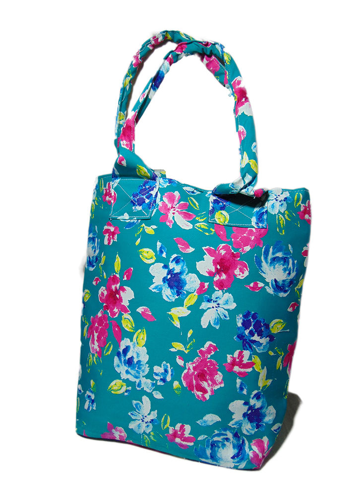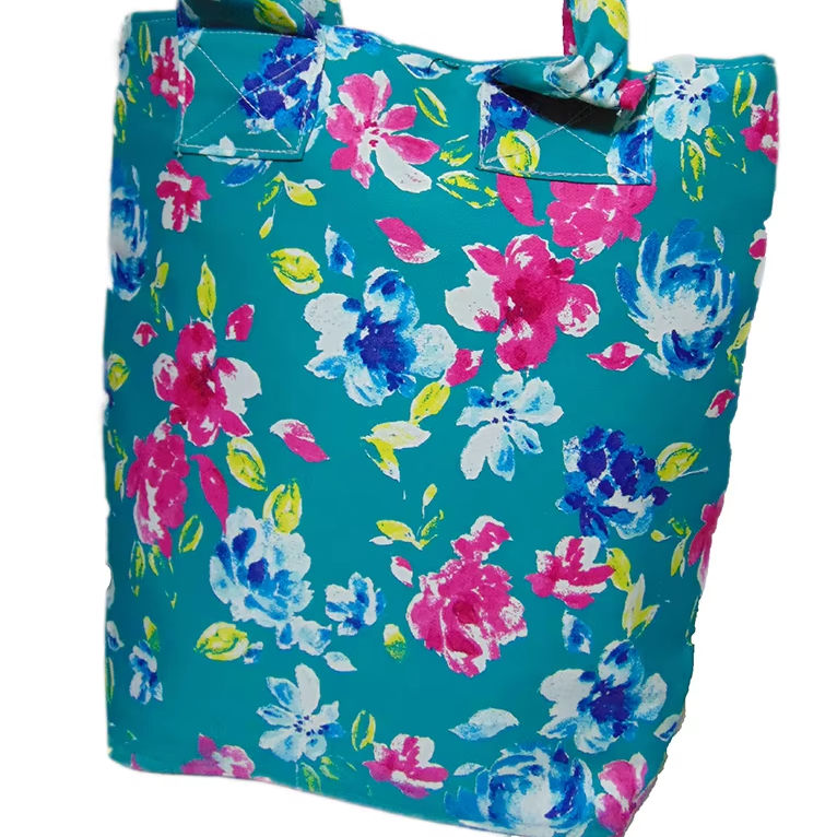 Sac de plage en toile écologique avec logo personnalisé motif floral vert de mer doublure imperméable sergé de coton compartiment zippé promotionnel