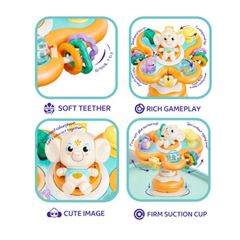 Hochet de dentition précoce pour bébé thème éléphant avec logo personnalisé ensemble de jouets pour nouveau-né jouet en silicone avec ventouse jouet de table à dîner