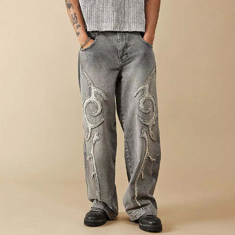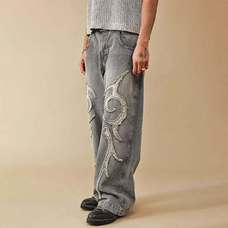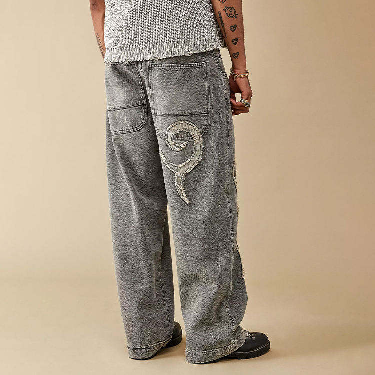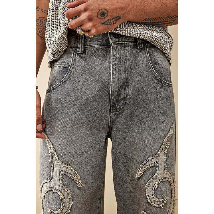 Jeans personnalisés avec logo brodé, patchwork, gris délavé, coupe droite ample, style hip-hop streetwear, pour hommes