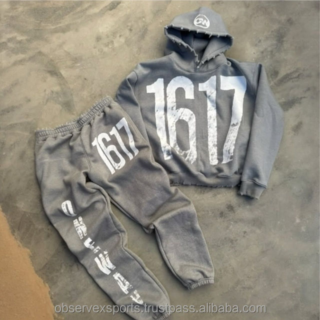 Ensemble 2 pièces sweat à capuche brodé de logo personnalisé survêtement homme vintage à fermeture éclair lourde Streetwear sweat-shirt