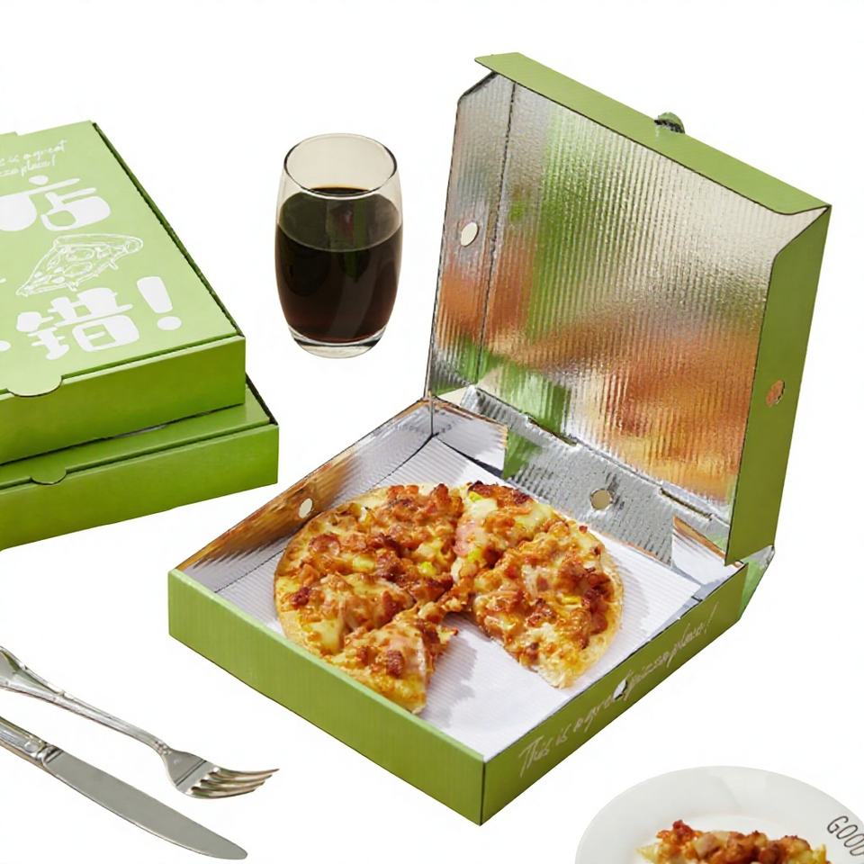 Boîte à pizza en carton ondulé avec logo personnalisé, matériaux recyclés de qualité alimentaire, plateau de pizzeria, boîtes alimentaires avec feuille de conservation de la chaleur