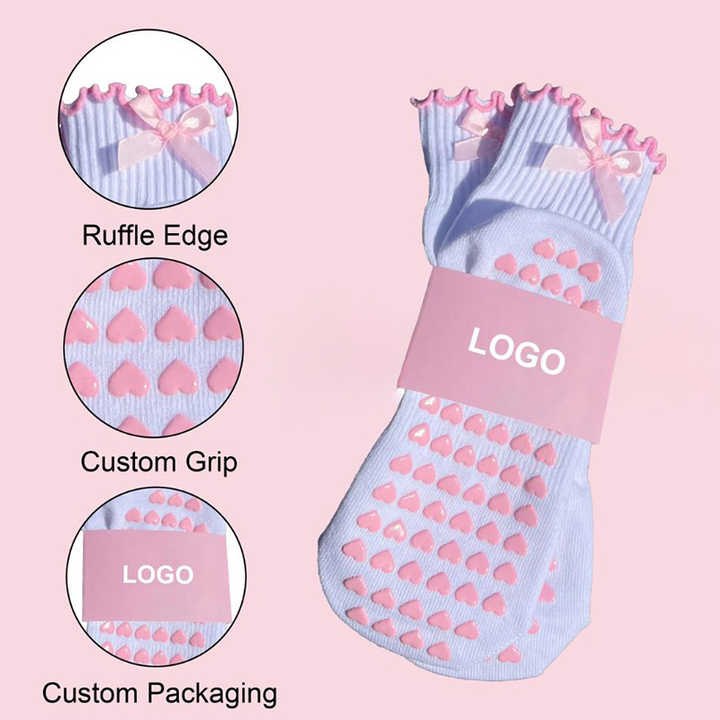 Chaussettes de danse antidérapantes pour filles avec logo personnalisé, bord festonné rose, pour ballet, barre, yoga, pilates, vente en gros pour femmes
