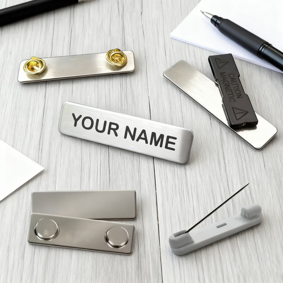 Badges personnalisés en acier inoxydable avec logo et nom doré – Créez votre propre badge nominatif vierge en métal