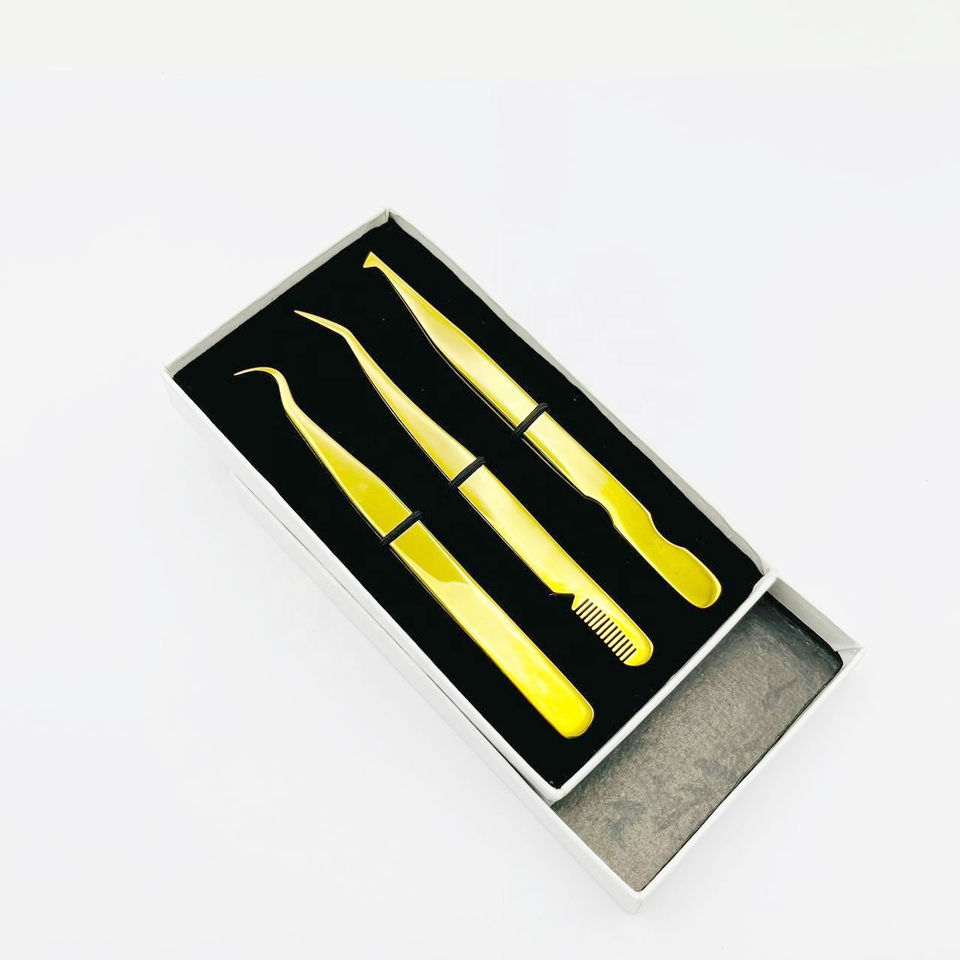 Pince à épiler plaquée or avec logo personnalisé Texture de pointe lisse avec peigne incurvé de type crochet Fond en acier inoxydable durable