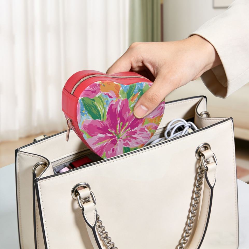 Étui à bijoux en cuir PU portable avec logo personnalisé, motif floral hawaïen, petit organisateur de voyage, forme de cœur rouge