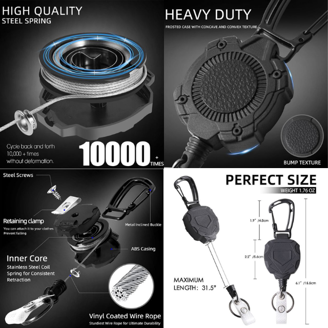 Porte-clés mousqueton multi-outils robuste avec logo personnalisé, enrouleur de badge rétractable en ABS avec cordon en fil d'acier, porte-carte d'identité tactique