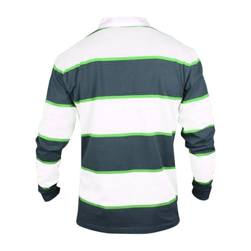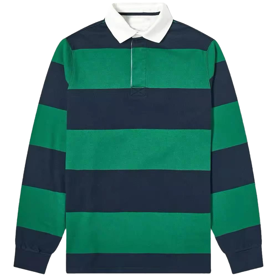 Chemise de rugby en coton lourd avec logo personnalisé, manches longues, polo rayé, vert marine, col blanc contrastant, maillot de rugby classique