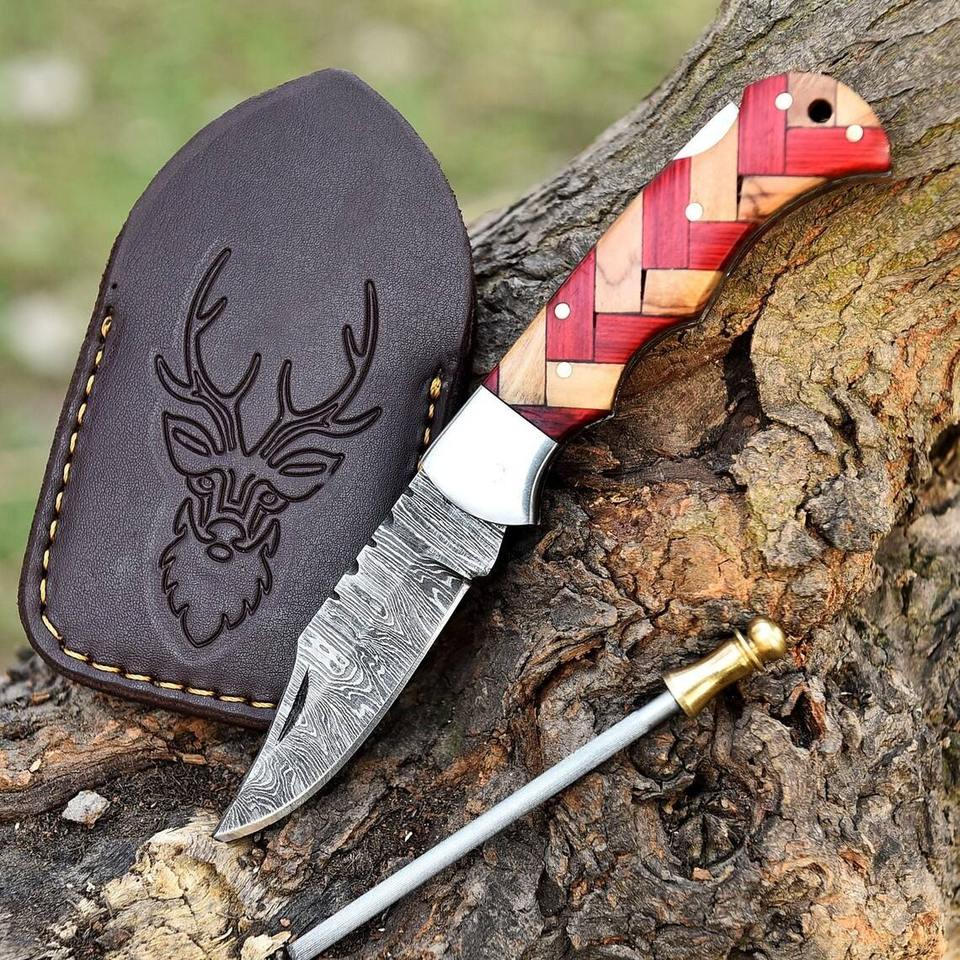 Couteau de poche pliant en acier Damas de haute qualité avec logo personnalisé, étui en cuir de luxe, camping, chasse, livraison directe