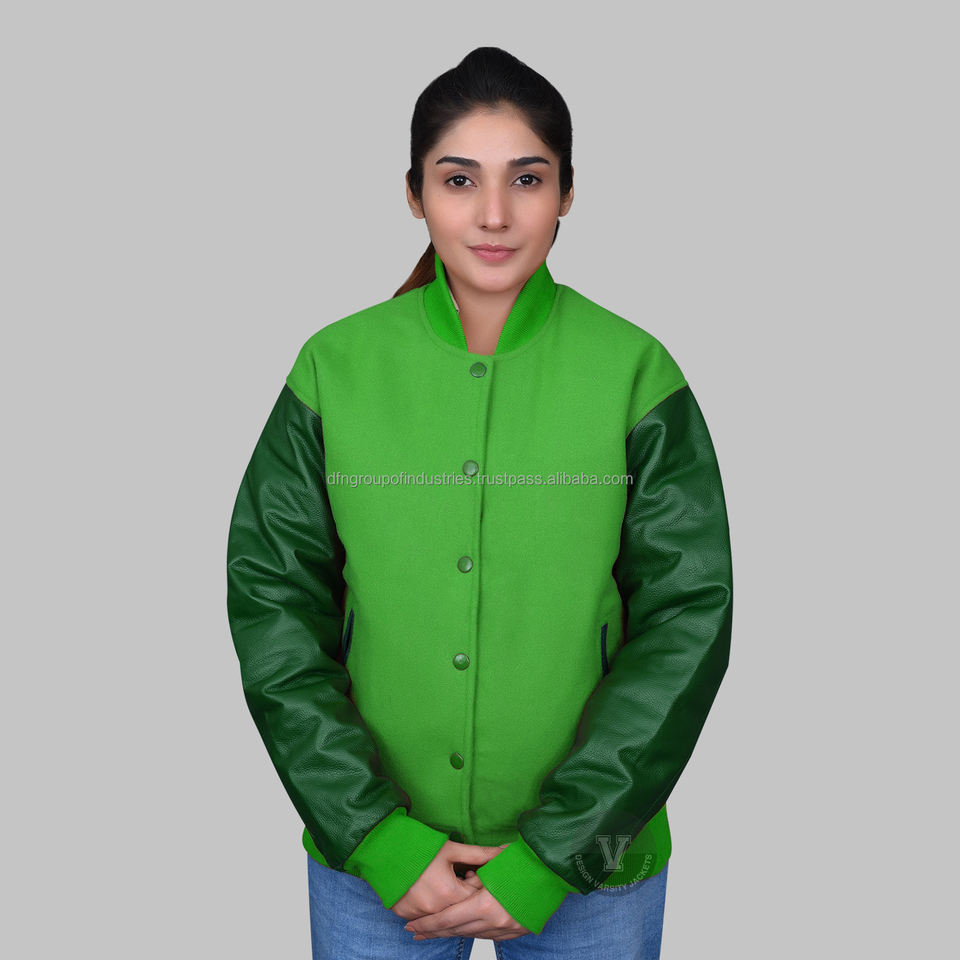 Logo personnalisé veste universitaire de haute qualité pour hommes coupe classique vert Melton laine cuir manches collège style forêt peau de vache vert