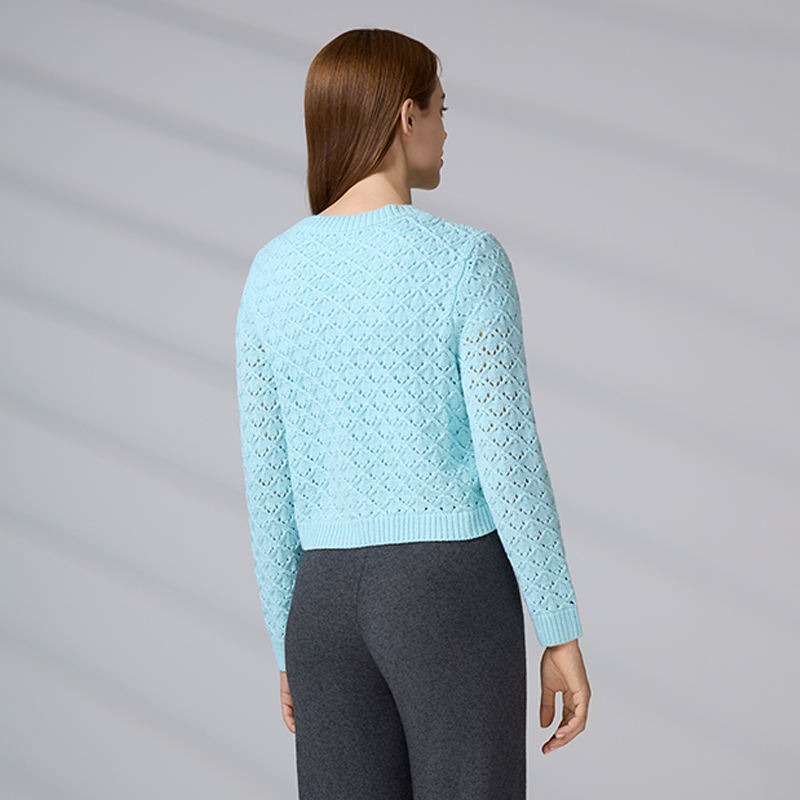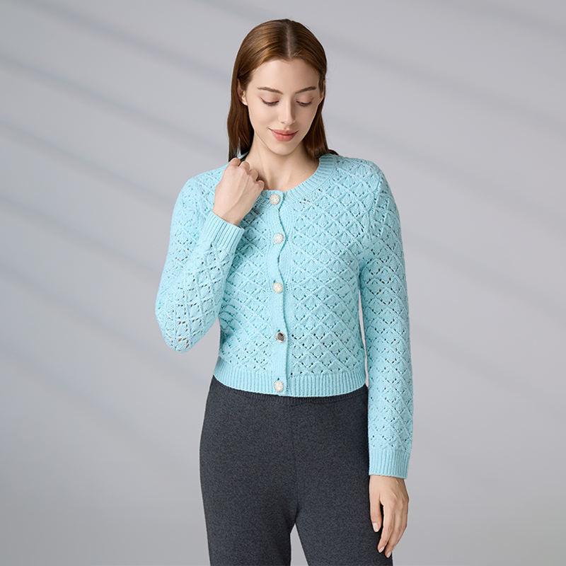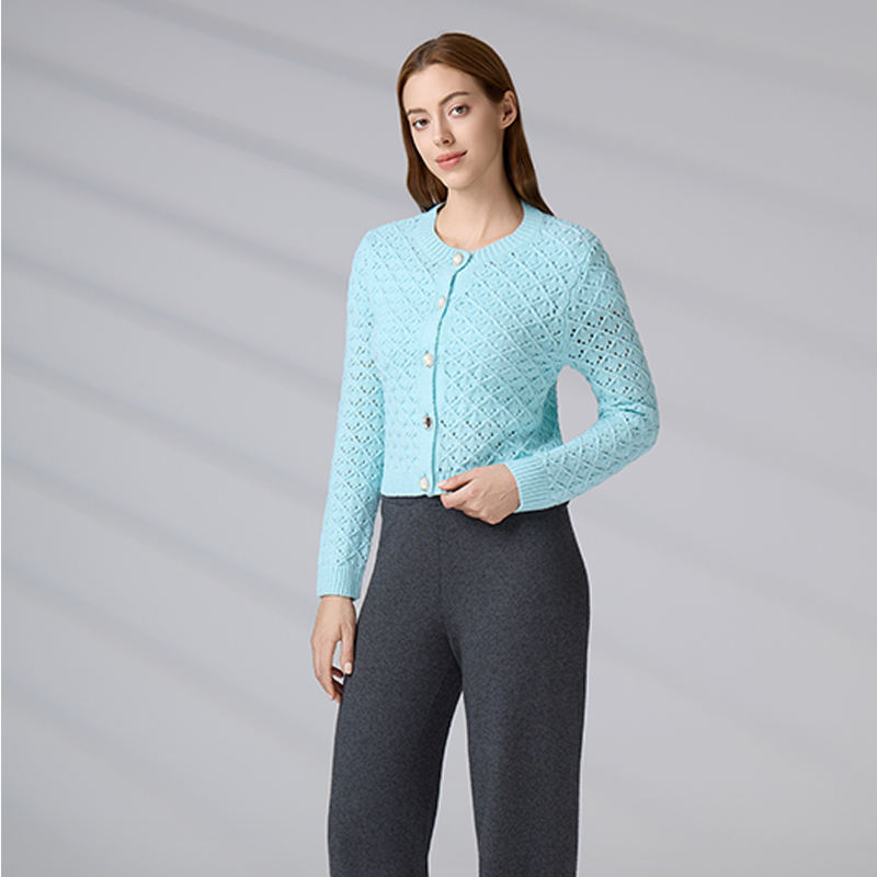 Pull personnalisé avec logo, tricot ajouré bleu clair d'hiver, col rond, boutonné, pull court en tricot pour femmes, cardigan