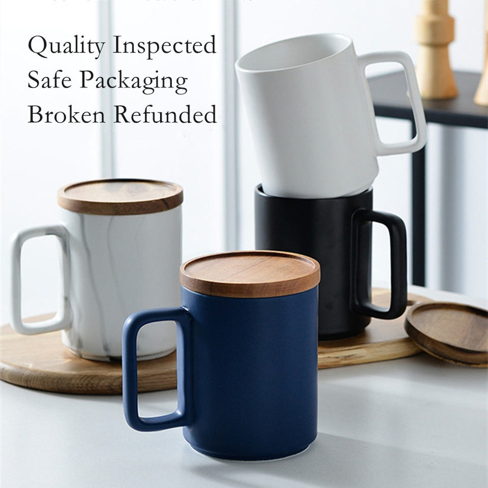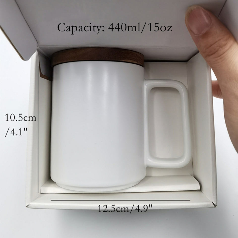 Grande Tasse à Café en Céramique Nordique Mat 15oz avec Logo Personnalisé, Couvercle en Bois et Boîte Cadeau – Bleu, Noir, Blanc